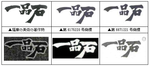 2007年7月、広東省湛江市の住民である鄭某氏が、「電気圧力鍋」などの臺所用品について第6175220號商標「一品石」の登録を出願し、同年8月に湛江市に某公司を設立した。2008年4月、鄭某氏は、別の第6671221號商標「一品石」の登録を出願した。當該商標は前の商標とは若干フォントが異なるものであり、著作権図面および本件の関連標章は、以下の添付寫真で示すとおりである。