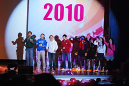 下午3點,熱情洋溢的互動游戲帶動整個報告廳沸騰了起來,伴著開場音樂的響起,碩大的幕布徐徐拉開,屏幕中的開場影像迫不及待地進入大家的視野,記錄著2009我們走過的快樂日子;舞臺兩側的巨型展板格外醒目,躍動的五彩線條讓舞臺變得更加閃耀;臺下熒光閃爍,掌聲四起,由所有員工組成的八大方陣呼聲一浪高過一浪,這里變成了歡呼的世界,快樂的海洋……