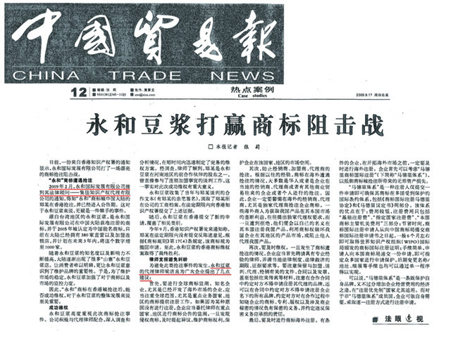 《中國貿易報》:永和豆漿打贏商標阻擊戰