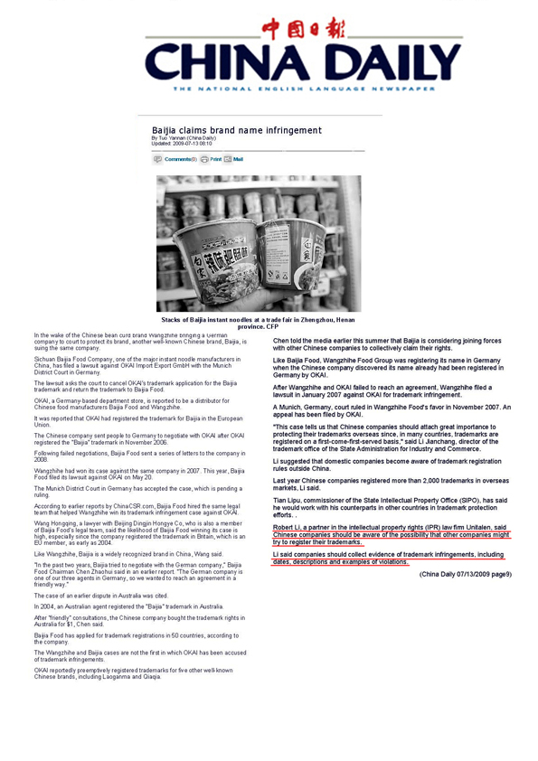 《CHINA DAILY》:Baijia claims brand name infringement