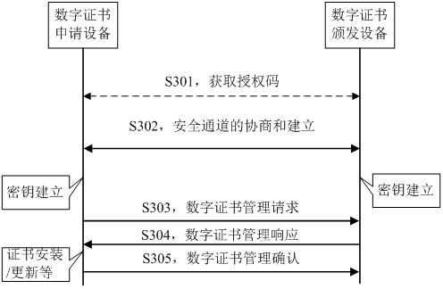 數字證書頒發設備接收所述數字證書管理請求消息,利用所述安全數據通道向數字證書申請設備發送數字證書管理響應消息,所述數字證書申請設備利用所述安全數據通道接收所述數字證書管理響應消息,所述數字證書管理響應消息經所述數據通信密鑰加密處理;