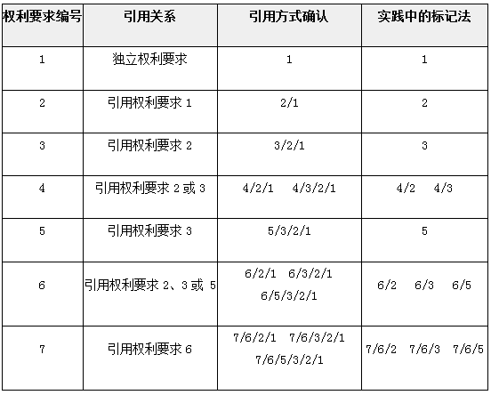 在上表中給出的權(quán)利要求引用關(guān)系中,在判斷時(shí)每個(gè)權(quán)利要求的每個(gè)方案都必須單獨(dú)被對(duì)待。對(duì)于其中存在的多項(xiàng)引用權(quán)利要求(上表中的權(quán)利要求4、6和7),當(dāng)其接到拒絕理由、限制要求或?qū)彶閱T的其他要求或意見(jiàn)時(shí),可僅針對(duì)單個(gè)權(quán)利要求提出。例如,對(duì)于權(quán)利要求4引用權(quán)利要求2的方案、權(quán)利要求4引用權(quán)利要求3的方案,當(dāng)遇到反對(duì)理由時(shí),可僅在反對(duì)理由中針對(duì)權(quán)利要求4提出。