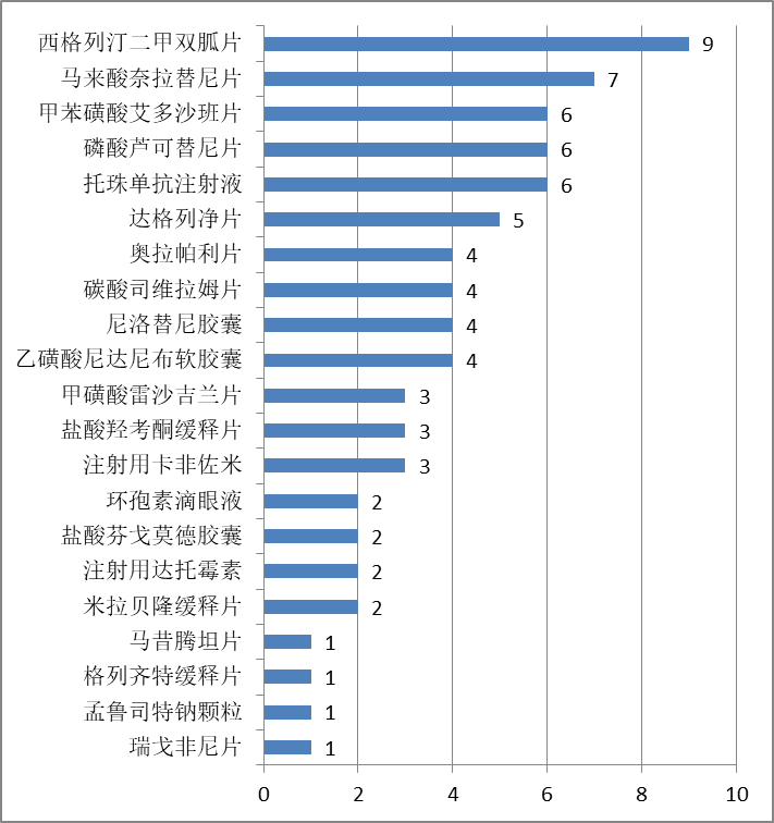 76件公開的案件共涉及21種藥品,這些藥品的基本信息如下: