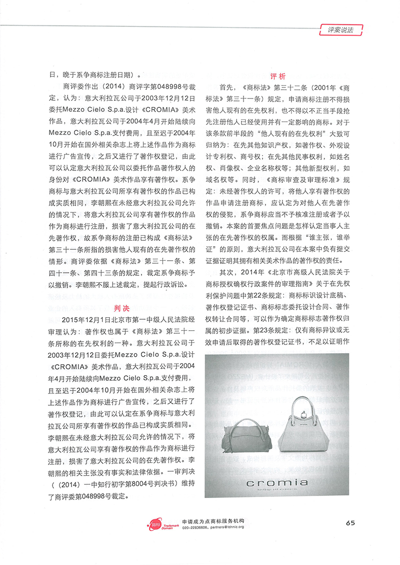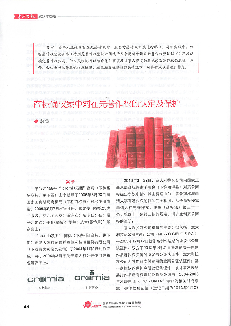 集佳文章《商標(biāo)確權(quán)案中對(duì)在先著作權(quán)的認(rèn)定及保護(hù)》在《中華商標(biāo)》發(fā)表