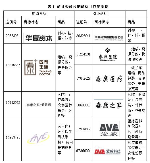表1 商評委通過的商標共存的案例