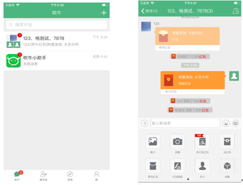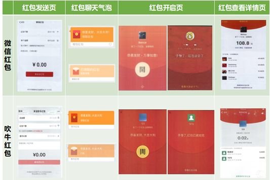 騰訊公司主張“吹?!避浖刑峁┘t包收發服務,在紅包發送接收全過程中所使用的紅包發送頁、聊天氣泡、開啟頁、查看詳情頁等界面全面抄襲、模仿騰訊公司“微信紅包”相關界面。此外“吹牛”軟件中還使用與“微信”軟件底部界面“聊天、通訊錄、發現、我”圖標高度近似的圖標等。上述行為涉嫌侵犯騰訊公司相關作品著作權,并構成不正當競爭。