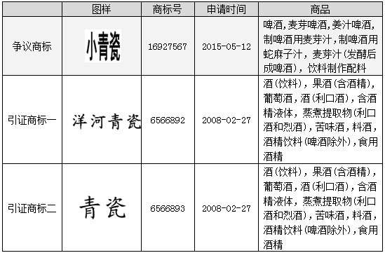 原告江蘇洋河酒廠股份有限公司(以下簡稱“洋河酒廠”)早在2008年,就在第33類“酒(飲料)”等商品上注冊了“洋河青瓷”、“青瓷”商標,并且早在其注冊之前,自1999年開始就在“白酒”商品上開始使用“青瓷”商標。但是,在2015年,英國凱撒啤酒有限公司在第32類“啤酒”等商品上注冊了“小青瓷”商標。因此,洋河酒廠對該商標提出了異議,異議的理由即為訴爭商標與引證商標構成類似商品上的近似商標。