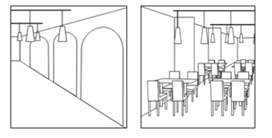 當提交多組圖片/照片,以說明立體商標時,各圖片/照片的細節(jié)需具有對應(yīng)關(guān)系,以說明系同一保護對象。如以下示例1中,左右兩張圖片除了天花板頂部吊燈設(shè)計,其他格局和桌椅擺放等,并不能表明為同一場景。因此,僅提交以下兩張圖片無法滿足店鋪裝潢的立體商標申請要求。