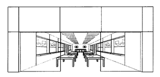 同日本立體商標申請類似,美國店面外觀和內(nèi)部裝潢的商標申請在提交商標圖樣時,亦可通過虛實線的組合方式,體現(xiàn)商標的具體保護范圍。如以下蘋果公司在第35類“零售商店服務(wù),包括計算機,計算機軟件,計算機外圍設(shè)備,移動電話,消費類電子產(chǎn)品和相關(guān)配件以及與之相關(guān)的產(chǎn)品展示”服務(wù)上所提交的第4277914號商標所示:
