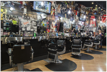 商標描述:該商標包括一家理發(fā)店的內(nèi)部設(shè)計,包括金屬籠中的蒸氣鎖燈,帶裸露燈泡的吊燈,工具箱,帶有切入口和切出口的不銹鋼工作臺面,垂直的墻面招牌和展示架,音樂主題海報展示墻。虛線所示的特征不作為商標的一部分,僅用于顯示這些特征的位置。