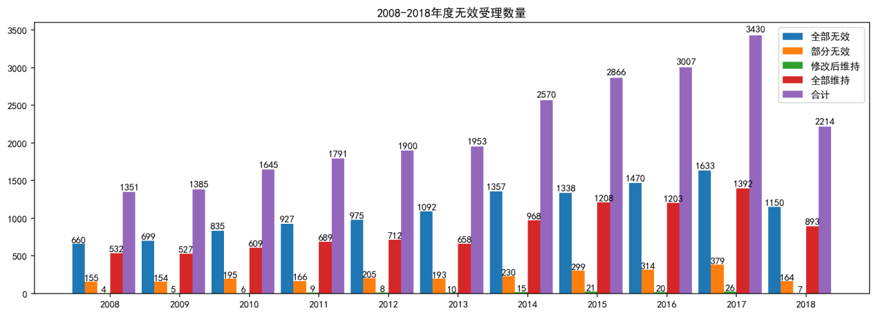 【2】需要說(shuō)明的是,復(fù)審委網(wǎng)站公開(kāi)的數(shù)據(jù)本身存在一些問(wèn)題(例如個(gè)別決定存在信息缺失錯(cuò)誤等,尤其是早期發(fā)布的無(wú)效決定信息錯(cuò)誤較多),因此,筆者在統(tǒng)計(jì)過(guò)程中剔除了一些錯(cuò)誤或無(wú)法使用的數(shù)據(jù),并重點(diǎn)統(tǒng)計(jì)了2008年后近十年的數(shù)據(jù)。考慮到數(shù)據(jù)的剔除以及編寫(xiě)的算法可能存在的不足,下面的統(tǒng)計(jì)結(jié)果會(huì)存在一定誤差。另外,考慮到無(wú)效決定都是已經(jīng)完結(jié)的案件,下面的全部統(tǒng)計(jì)分析都沒(méi)有包括尚處于無(wú)效程序中的案件。