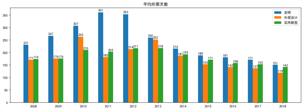 (2)無(wú)論在哪一個(gè)年度,發(fā)明專利的耗時(shí)都要比其它二者更長(zhǎng);一般情況下,外觀設(shè)計(jì)專利用時(shí)最短。