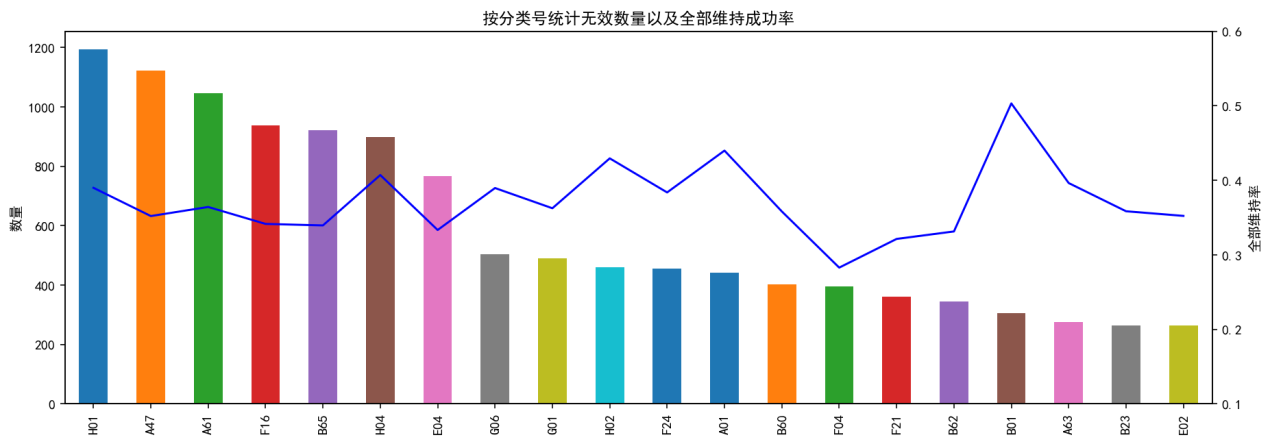 上圖為按分類號(hào)(僅取每個(gè)案件的前三位)統(tǒng)計(jì)的無(wú)效宣告請(qǐng)求案件數(shù)量以及其中全部維持決定的占比。從圖中可以看出,H01(基本電氣元件)、A47(家具;家庭用的物品或設(shè)備;咖啡磨;香料磨;一般吸塵器)、A61(醫(yī)學(xué)或獸醫(yī)學(xué);衛(wèi)生學(xué))這三類的無(wú)效宣告請(qǐng)求案件數(shù)量最多,均超過(guò)1000件。