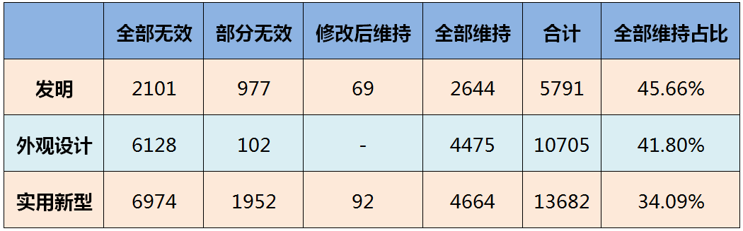 上表為按專利類型統(tǒng)計(jì)的各種情況的案件數(shù)量。總體上看,發(fā)明專利宣告維持的比例要遠(yuǎn)高于外觀設(shè)計(jì)專利和實(shí)用新型專利,即專利被宣告無(wú)效的概率從發(fā)明專利到外觀設(shè)計(jì)專利再到實(shí)用新型專利是逐步增加的,這也與我們一般的認(rèn)識(shí)相符。某種程度上,實(shí)用新型專利的低穩(wěn)定性,大幅增加了專利整體被宣告無(wú)效的比例。