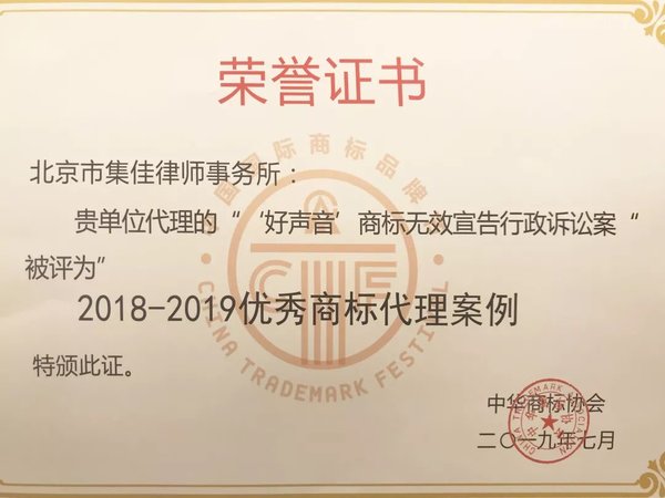 集佳代理“好聲音”商標無效宣告行政案入選“優秀商標代理案例”