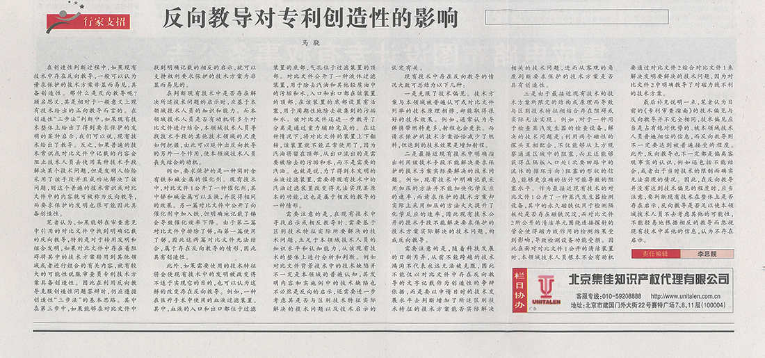集佳文章《反向教導(dǎo)對(duì)專利創(chuàng)造性的影響》在《中國(guó)知識(shí)產(chǎn)權(quán)報(bào)》發(fā)表