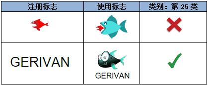 一般而言,當增加的要素為顯著要素,與已注冊標志相互作用,而使已注冊標志不具有獨立性時,則視為顯著要素變更,不能視為注冊標志的使用,如以下示例中,雖然均增加了大魚圖形的設計,但對第一組而言,形成了“大魚吃小魚”的新的標識含義,因而改變了原標志的顯著特征: