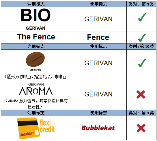 如上述示例,注冊商標指定在第32類礦泉水商品上,相較而言,圖形對指定商品具有一定暗示性,而顯著性較弱。因此,文字部分“GERIVAN”為該注冊商標的主要顯著部分。第一組中的使用標志僅是對圖形和文字的位置進行了調整,不影響文字部分的顯著性。而第二組的使用標志對文字進行了拆分,形成了新的商業印象,故視為實質變更。