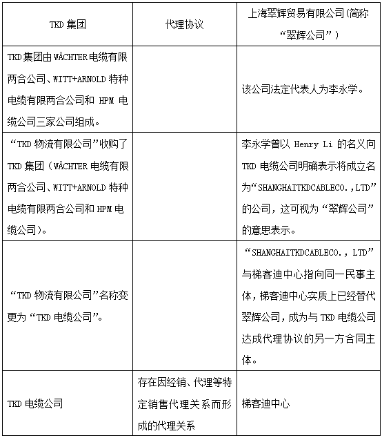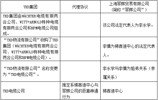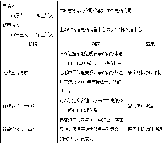 可知,該案雙方雖然不屬于直接的代理關系(即無法簡單通過代理、經銷合同以及交易憑證、采購資料等就直接體現雙方的代理或經銷關系),但通過關系的梳理及以多份證據共同形成證據鏈,一方面可證明梯客迪中心實質上已經替代翠輝公司,成為與TKD電纜公司達成代理協議的另一方合同主體,從而可以認定雙方存在代理關系;另一方面,也可證明梯客迪中心和翠輝公司的法定代表人為親屬關系,從而推定其之間具有串通合謀行為。由此,法院認定該案雙方之間存在代理關系,并適用《商標法》第十五條第一款對其予以規制。