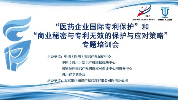 2021年5月27日,由中國(四川)知識產權保護中心、中國(四川)知識產權維權援助中心、國家海外知識產權糾紛應對指導中心四川分中心、四川省專利協會主辦,北京集佳知識產權代理有限公司承辦的“醫藥企業國際專利保護”和“商業秘密與專利無效的保護應對策略”專題培訓分享會在成都成功舉辦。