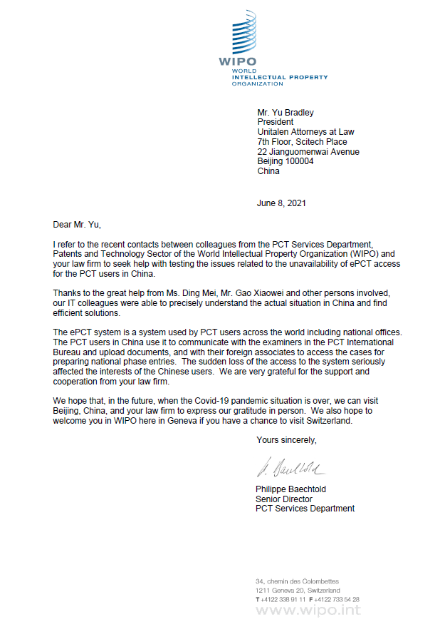 近日,世界知識產權組織(WIPO)國際局PCT服務部高級司長Philippe Baechtold向集佳合伙人會議主席于澤輝所長發來感謝信,對協助PCT服務部完美解決了WIPO ePCT系統在中國使用問題的集佳工作人員表示衷心感謝!