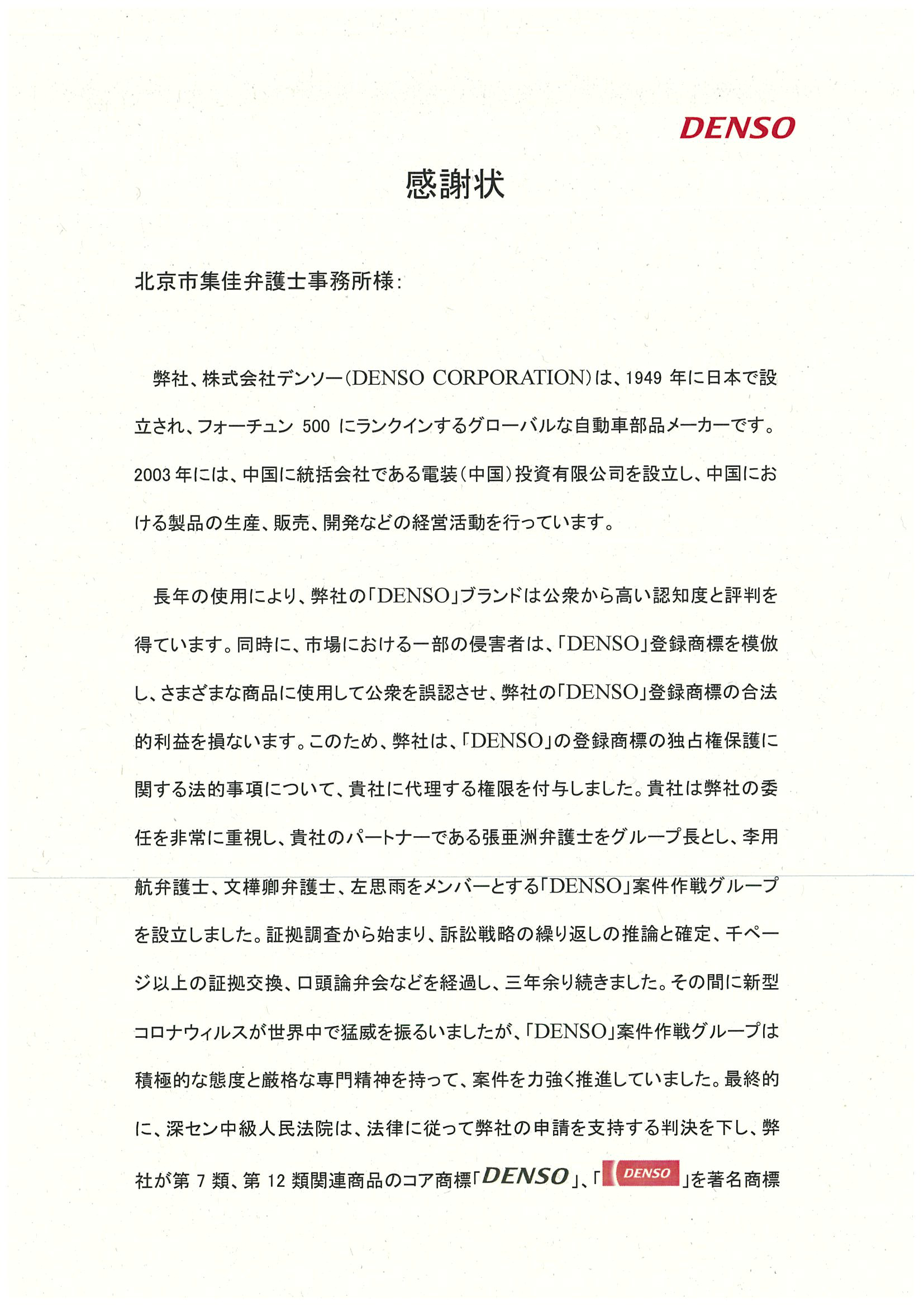 針對市場上一些侵權人摹仿、復制“DENSO”注冊商標并將其使用在不同類別商品上誤導公眾的不法行為,株式會社電裝委托集佳就“DENSO”注冊商標專用權保護事宜處理有關法律事務。集佳對此高度重視,成立了以合伙人張亞洲律師為組長,以李用航律師、文樺卿律師和左思雨為組員的“DENSO”案專門工作組,自證據調查始,經歷了訴訟策略反復推演及確定、上千頁的證據交換、庭審等,持續三年有余,期間又逢疫情肆虐,但是DENSO案工作組秉持積極可為的態度和嚴謹求實的專業精神克服重重困難,有力地推動案件進程。最終,深圳市中級人民法院依法作出裁判,認定株式會社電裝的注冊商標“