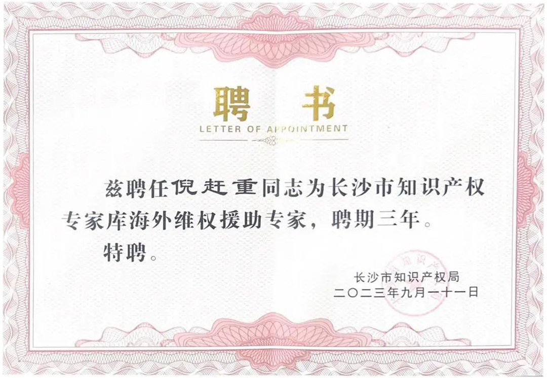 近期,長(zhǎng)沙市知識(shí)產(chǎn)權(quán)局公布了第二批長(zhǎng)沙市海外知識(shí)產(chǎn)權(quán)維權(quán)援助專(zhuān)家名單,集佳趙雷、朱剛琴、徐思、倪趕重4位專(zhuān)家入選。