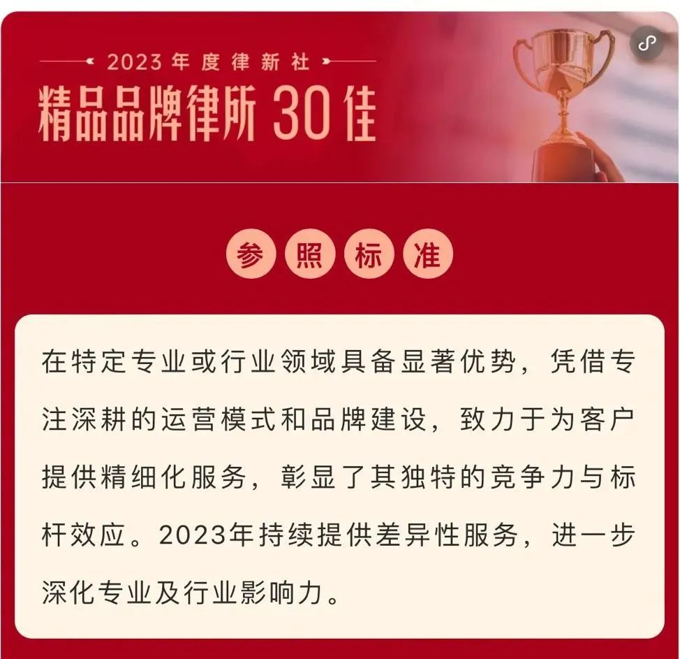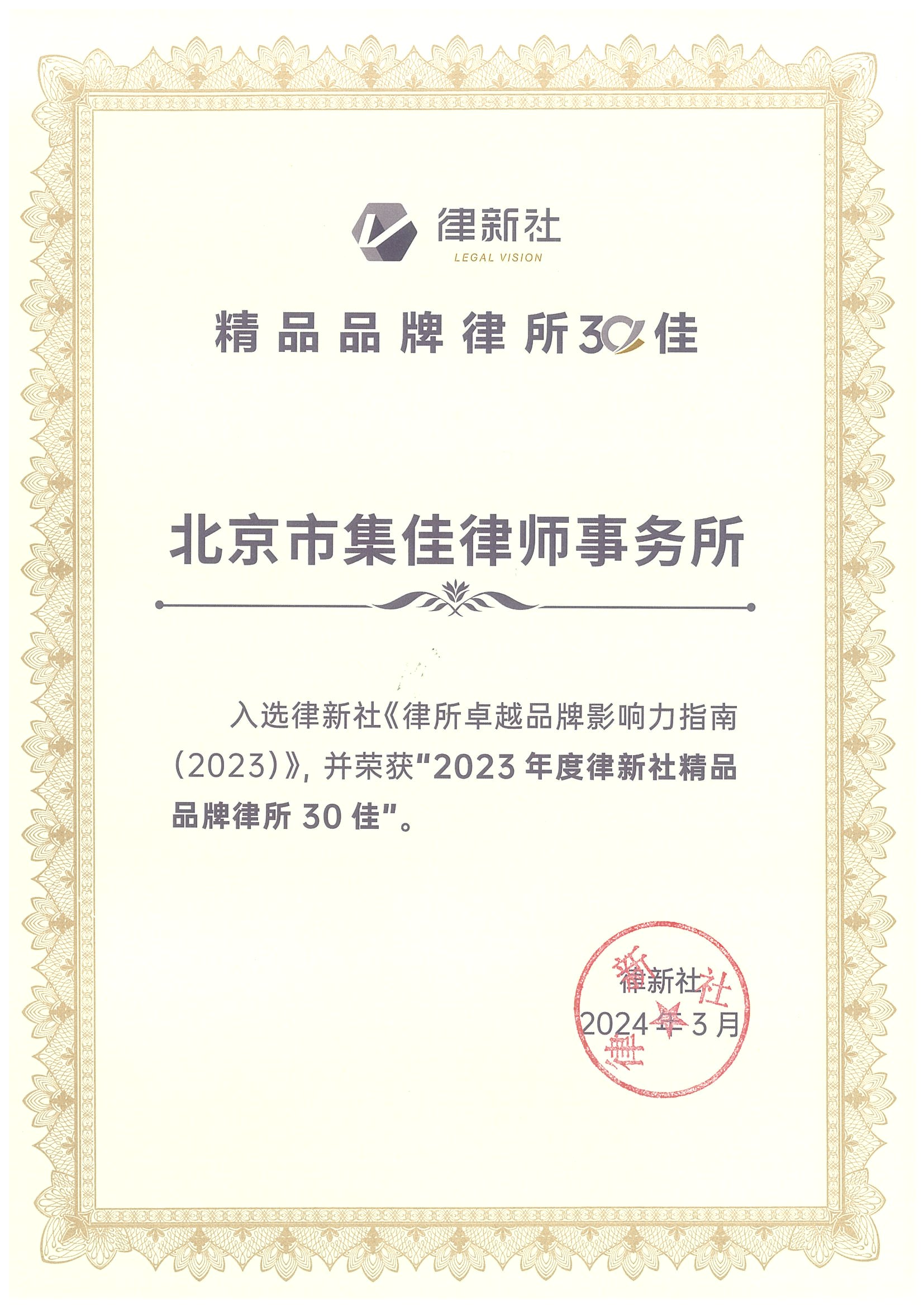 2024年3月2日,由中國(guó)法學(xué)交流基金會(huì)指導(dǎo)、律新社主辦的“致·追光者”第二屆法律服務(wù)業(yè)品牌發(fā)展論壇暨律新社2023年度品牌盛典隆重舉行,現(xiàn)場(chǎng)發(fā)布了備受關(guān)注的《律所卓越品牌影響力指南(2023)》,北京市集佳律師事務(wù)所憑借在知識(shí)產(chǎn)權(quán)領(lǐng)域的卓越實(shí)力和良好口碑,榮登“2023年度律新社精品品牌律所30佳”榜單。