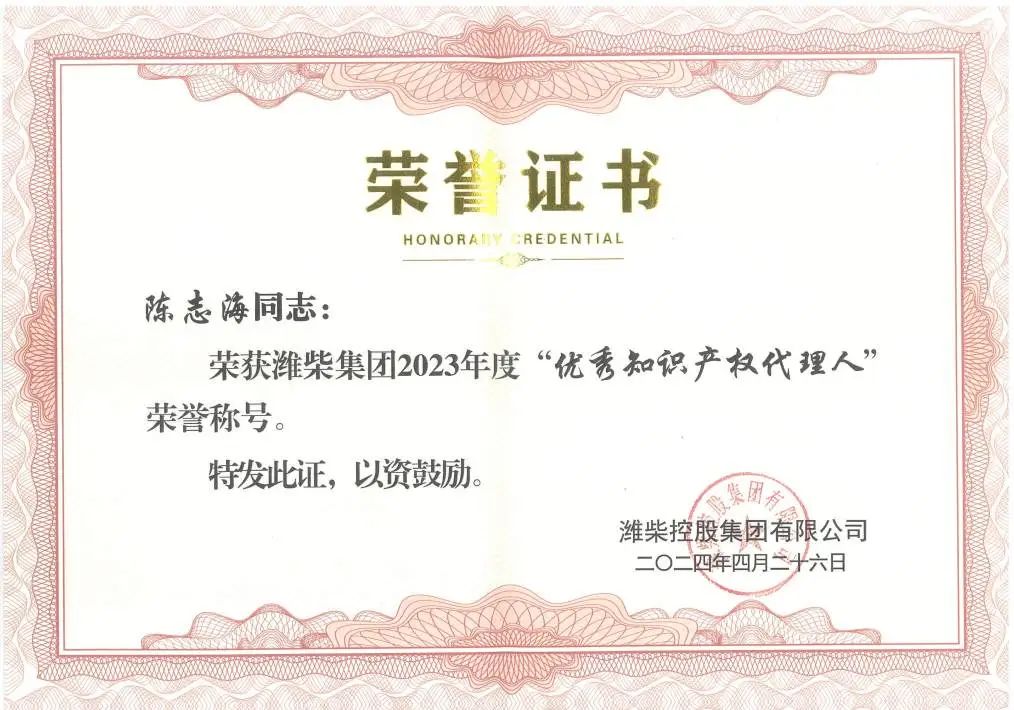 同時(shí),濰柴集團(tuán)授予集佳專利代理師陳志海、魏丹2023年度“優(yōu)秀知識(shí)產(chǎn)權(quán)代理人”榮譽(yù)稱號(hào),對(duì)他們精湛的業(yè)務(wù)能力與認(rèn)真負(fù)責(zé)的專業(yè)態(tài)度點(diǎn)贊!