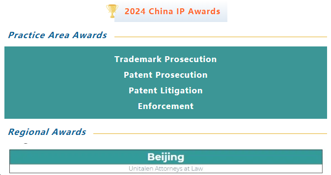 Recently, the international authoritative intellectual property media "Asia IP" released the list of winners of the 2024 China IP Awards. With outstanding performance, industry reputation, and market evaluation in the field of intellectual property business, Unitalen has been listed on the four recommendation lists of "Trademark Prosecution," "Patent Prosecution," "Patent Litigation," and "Enforcement Firms of the Year," and won the award "Regional Firms of the Year (Beijing)" consecutively!
