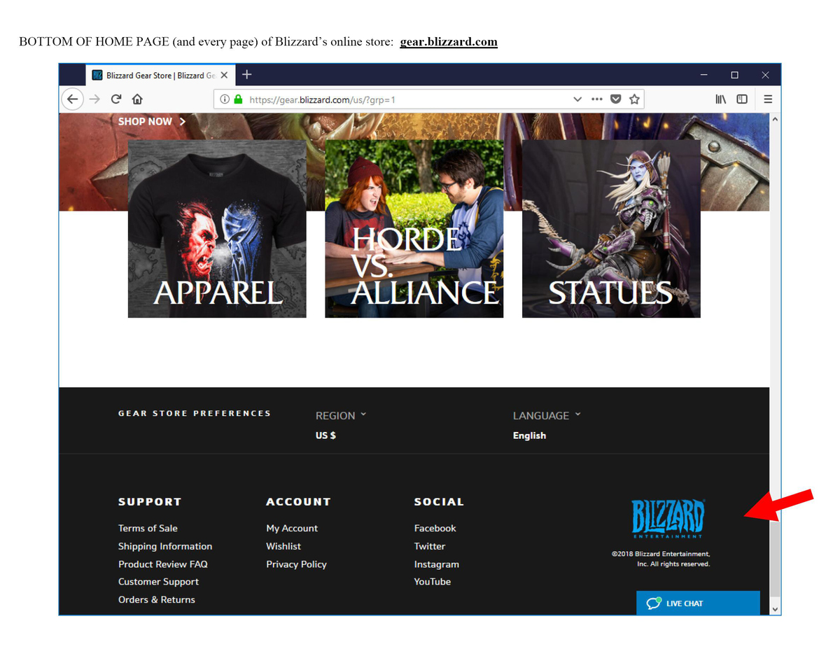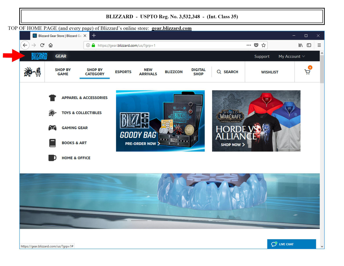 關于商標申請人關注的自營商店證據能否作為第35類使用證據被美國專利商標局接受這一問題。前文提及Blizzard面對Ava Labs提出的反訴理由曾主張其提交的使用證據是否存在瑕疵是審查員和申請人之間的問題,言外之意即是強調其提交的使用證據已被美國專利商標局審查員認可為合格的第35類使用證據。當前實踐中,審查員大部分情況下會接受申請人在自己官網使用申請商標零售自己產品的證據。作為參考,以下為Blizzard于2018維護其商標注冊時提交的第35類零售商店服務使用證據,已被接受: