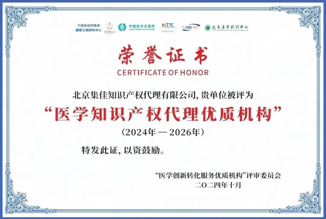 近日,2024年度“醫(yī)學(xué)創(chuàng)新轉(zhuǎn)化優(yōu)質(zhì)服務(wù)機構(gòu)”遴選結(jié)果在海口舉辦的個體化醫(yī)學(xué)研討會暨第四屆衛(wèi)生健康創(chuàng)新與轉(zhuǎn)化管理論壇上正式公布,北京集佳知識產(chǎn)權(quán)代理有限公司憑借在醫(yī)學(xué)創(chuàng)新成果知識產(chǎn)權(quán)保護與轉(zhuǎn)化方面的優(yōu)秀成績,榮獲2024年度“醫(yī)學(xué)知識產(chǎn)權(quán)代理優(yōu)質(zhì)機構(gòu)”稱號。