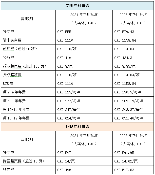 根據加拿大《服務費法案》的規定,加拿大專利申請中大多數費用將根據消費者價格指數(CPI)每年進行調整。目前在加拿大知識產權局官網公布的2025年預計調整的費用如下,按照以往慣例,每年最終調整的費用將按照四舍五入的原則取整數,因此,最終調整后的費用可能與下方所列費用有出入。