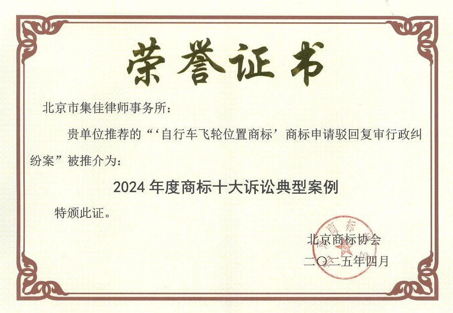 4月27日,北京商標(biāo)協(xié)會發(fā)布2024年度北京商標(biāo)十大訴訟典型案例,其中,集佳代理的斯拉姆有限責(zé)任公司(SRAM,LLC)訴國家知識產(chǎn)權(quán)局關(guān)于第G1729330號“自行車飛輪位置商標(biāo)”商標(biāo)申請駁回復(fù)審行政糾紛一案成功入選。
